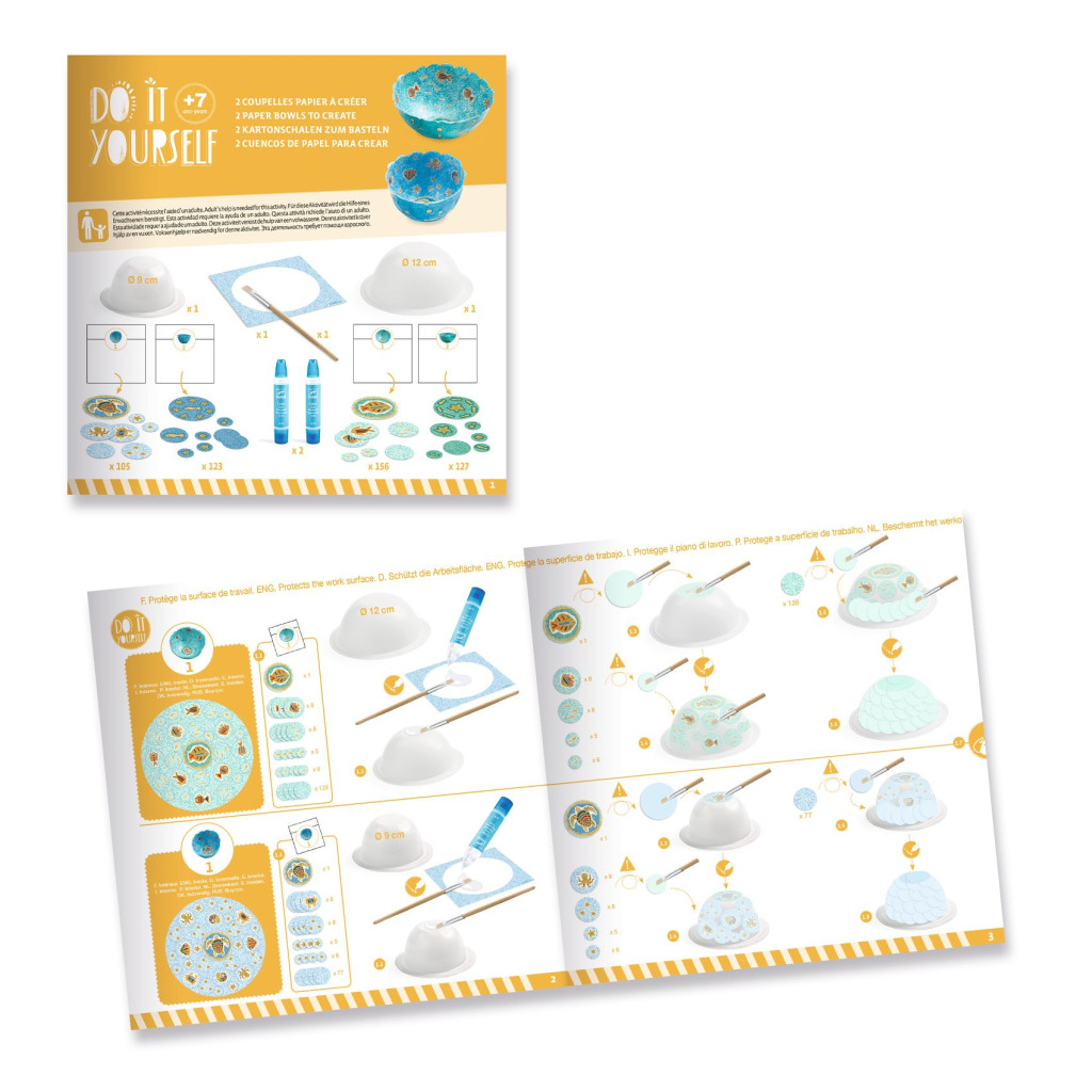 Teljes kreatív készlet két dekoratív papírtálka készítéséhez, csupán papír és ragasztó felhasználásával. A gyermek egyszerűen ragassza a nagy konfettidarabokat a formákhoz a folyékony ragasztóval, először a tál belsejére, majd a külső oldalára, hagyja megszáradni, majd vegye ki a formából. A (képes) használati útmutató részletes segítséget ad a tálkák elkészítésében.