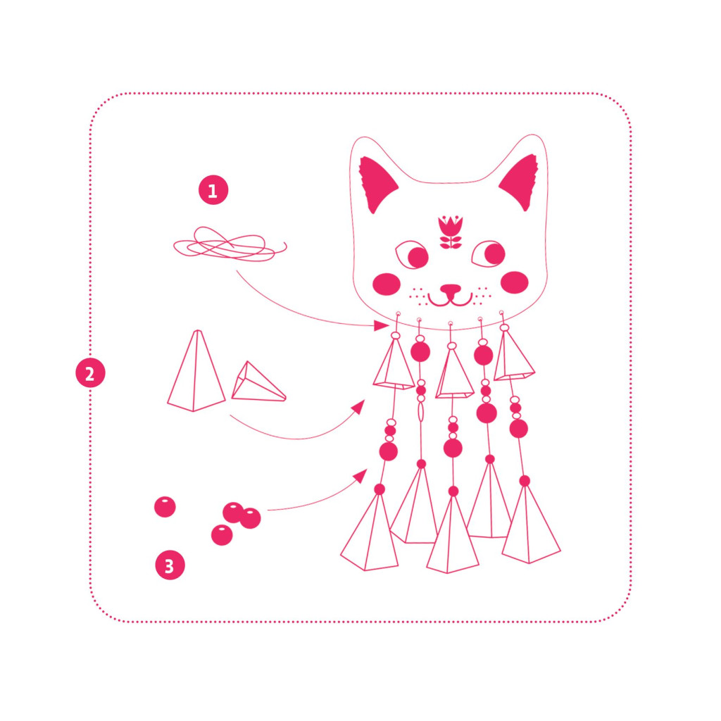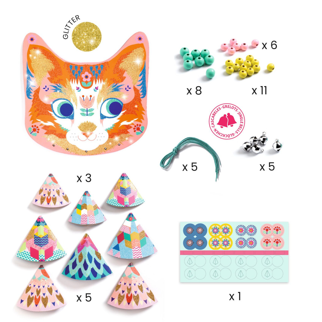 Cica pofiforma szélcsengő alapra, színes papír kúpokat, gyöngyöket és csengőket szerelhetnek a gyermekek. Már egy kis szellő fuvallat is elegendő, hogy az alkotás megszólaljon.