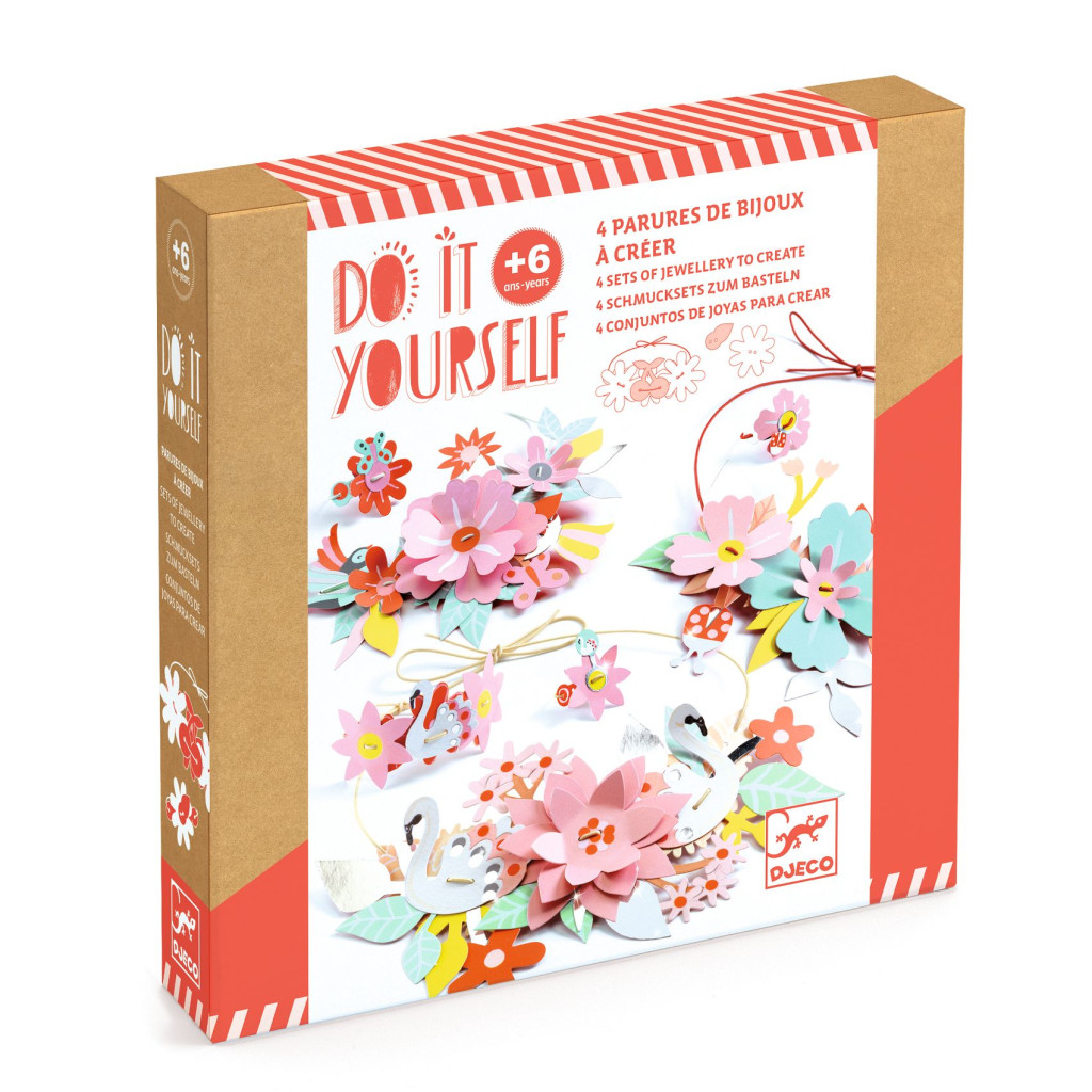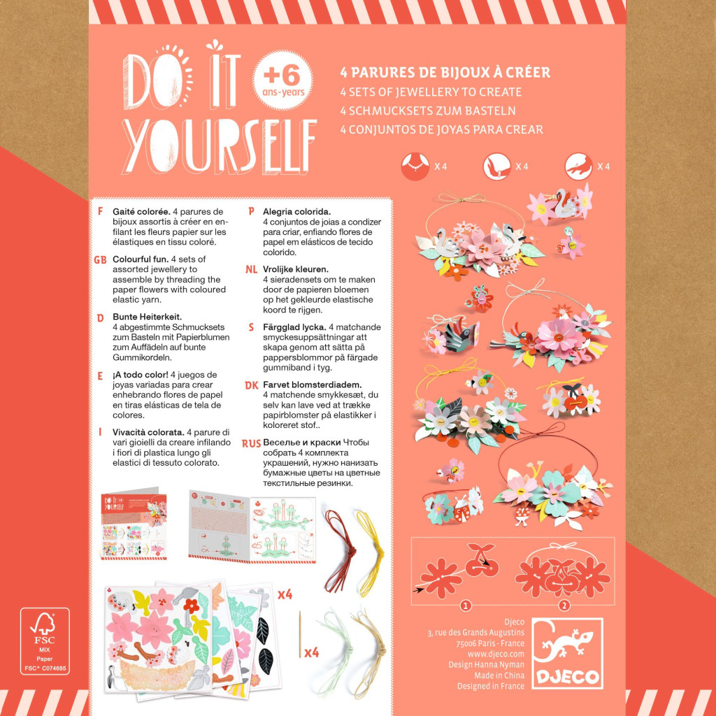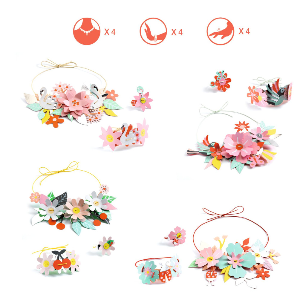 A kreatív készlet 4 db papírékszer készítéséhez, nagyon friss, üde virágos hangulatban. Minden készlet egy gyűrűből, egy karkötőből és egy nyakláncból áll. Mindegyik egyedi, ezüstszínű fémdarabokkal és különböző színű rugalmas fonallal készül. Az összerakás megkönnyítése érdekében a megfelelő darabokat átfúrták és megszámozták. A játékékszer részeit így egyszerűen csak fel kell fűzni a rugalmas drótra a lyukakon a feltüntetett sorrend szerint! A kész alkotáson a számozás nem fog látszani.