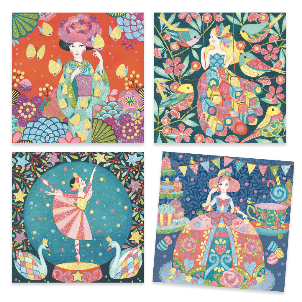 4 álomszerű kép, amelyeket színes mikrogolyócskákkal lehet teljessé tenni. A gyermek a kiválasztott képet a dobozba helyezi, a mellékelt eszközzel kibontja az előre felragasztott területeket, majd a füzetben megadott színkódot követve mikrogyönggyel szórja be azokat. A tevékenység végeztével a képen a lányok csillognak és szinte életre kelnek a varázslatos dekorációktól.