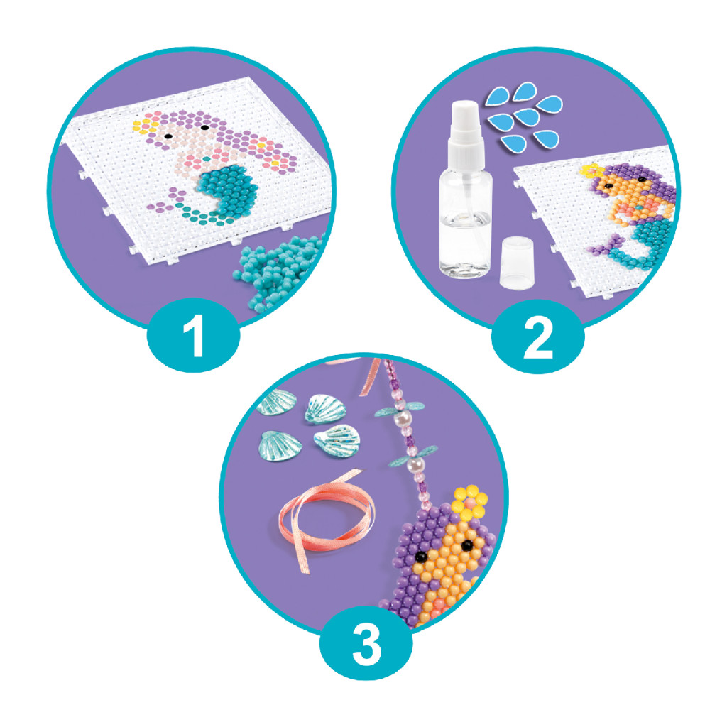 Gyöngyös állatfigurák készítése különleges ragasztótechnikával.Különleges élményt kínál ez a tengeri sellő és állatfigura építő játék, amivel függődíszek készíthetőek. Fejlesztő játék is egyben, figyelem, szem-kéz koordináció, a pontos másolása a sablonon megadott gyöngy helyeknek, elengedhetetlen feltétele a sikernek. A siker pedig motivál újabb sikerekre! Ezzel a függődíszkészítő készlettel garantáltan érkezik a siker öröme is!
