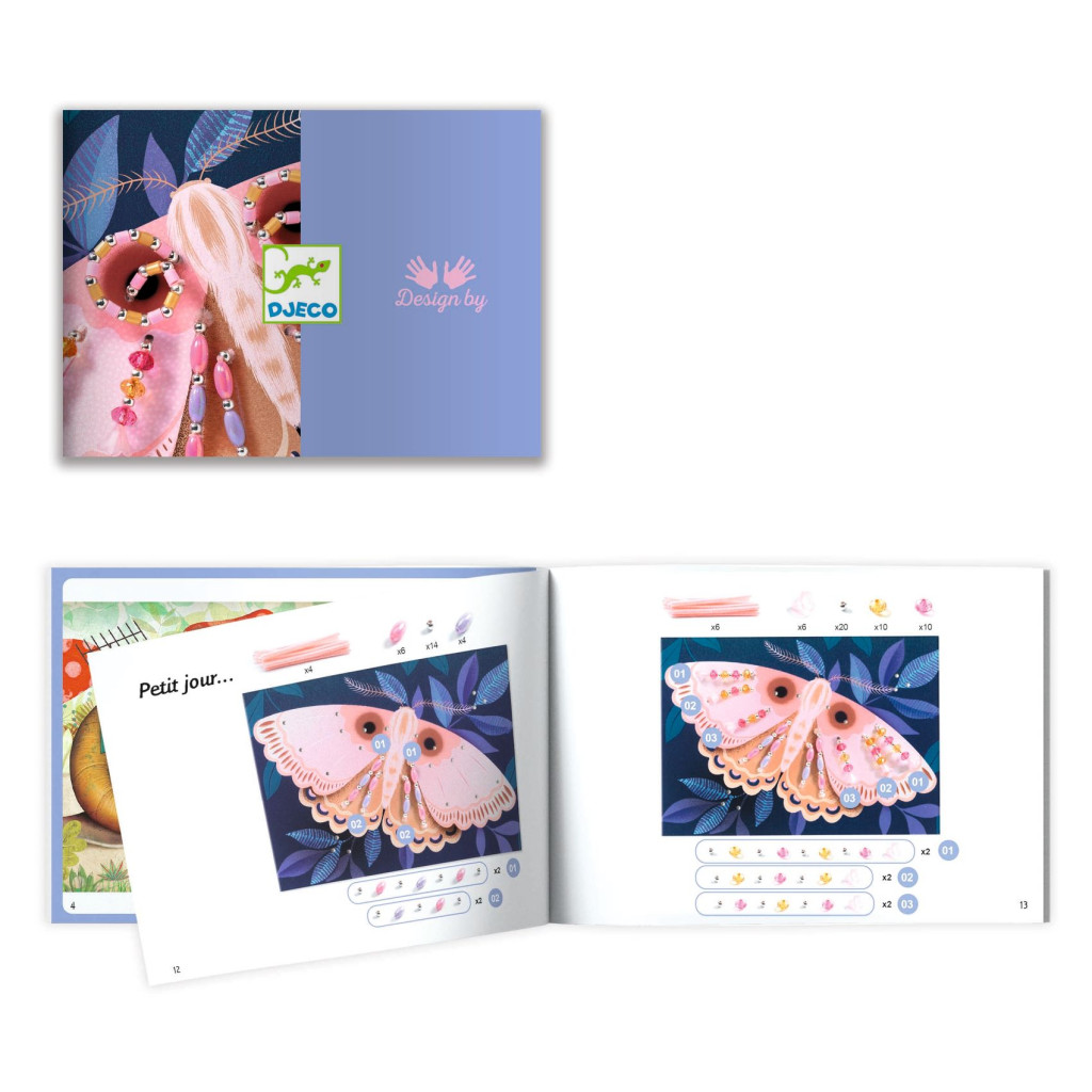 A különféle színű és megjelenésű gyöngyöket a füzetben található minták szerint felfűzzük a zseníliadrótokra, melyeknek a végeit a képek megfelelő részeibe bújtatjuk. A képeken található lyukak megkönnyítik a drótok fixálását. A feldíszített állatok (pillangó, bagoly és denevér) a gyöngyöknek köszönhetően éjszakai fényben pompáznak.